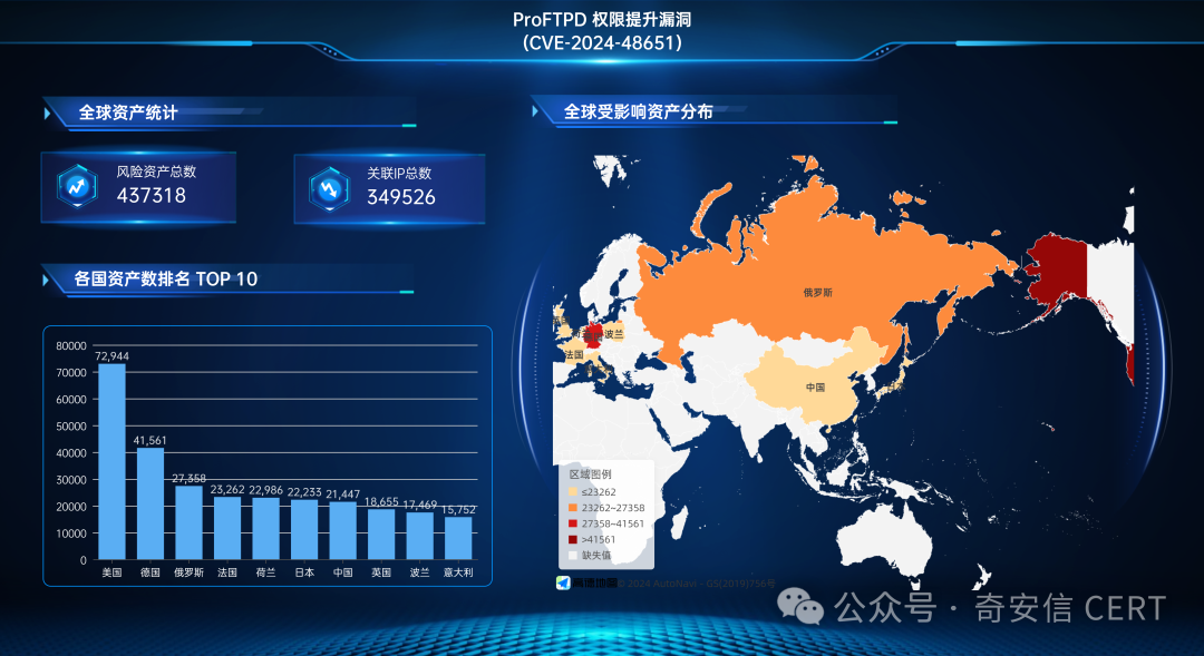 **ProFTPD 权限提升漏洞(CVE-2024-48651)关联的全球风险资产总数为437318个,关联IP总数为349526个。全球风险资产分布情况如下: