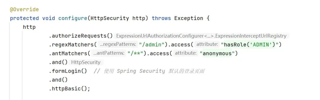 1. .regexMatchers(“/admin”).access(“hasRole(‘ADMIN’)”)