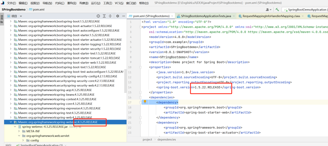 修改springboot的版本为1.5.22.RELEASE,这样对应的spring-web的mvc版本就为4.3.25, 是存在这个漏洞的。