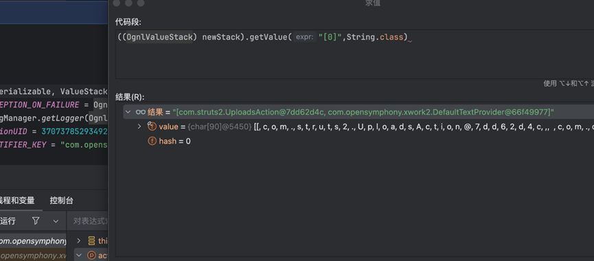 在Struts2中默认的实现为OgnlValueStack,Struts2在执行一次请求的过程中会把当前的Action对象自动存入值栈中,我们可以使用[0]获取整个栈对象,为方便显示转换为String对象,调用其 toString()方法输出对象信息,可以看到栈顶元素即为我们的Action对象。