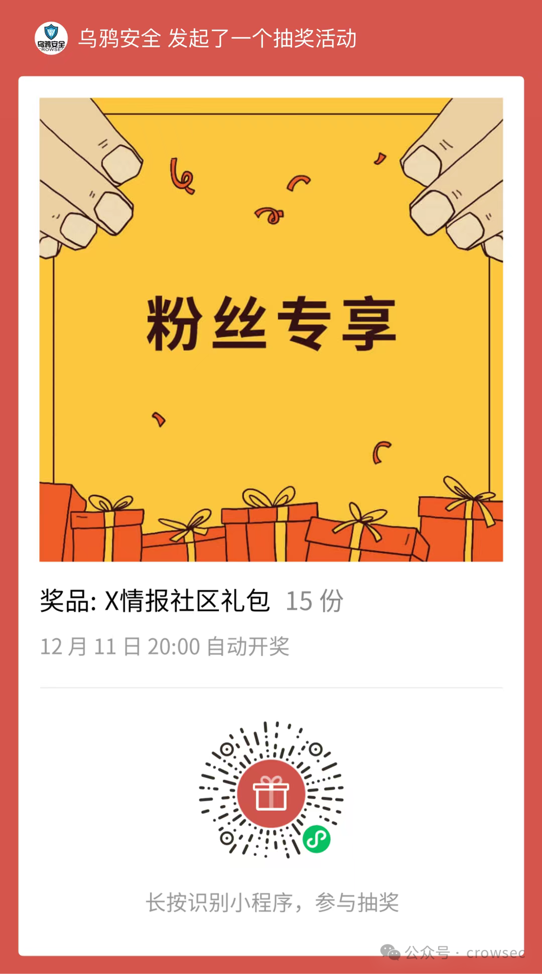 粉丝福利: 请关注乌鸦安全公众号,并在后台回复关键字:“抽奖”