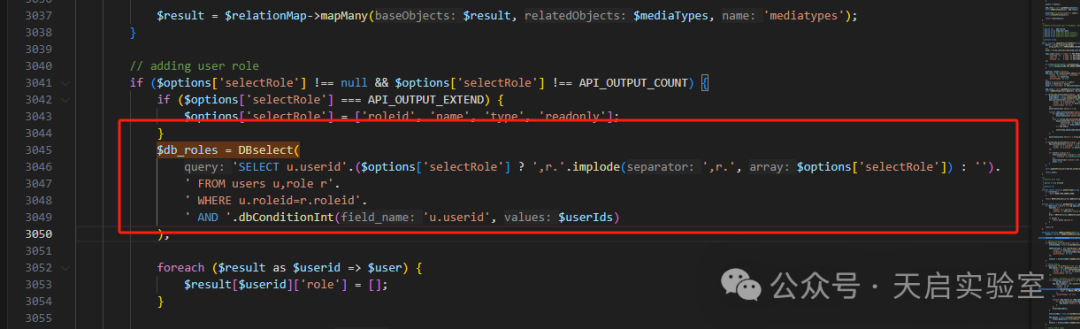 漏洞关键点在于include\classes\api\services\CUser.php的addRelatedObjects函数中。可以看到SQL语句中将处理后的$options[‘selectRole’]值直接拼接到了SQL语句中。而$options是直接从用户输入接收到的值,其他地方也没有对selectRole进行限制和过滤,只有最后有一个拼接。所以在这里直接导致了SQL注入。