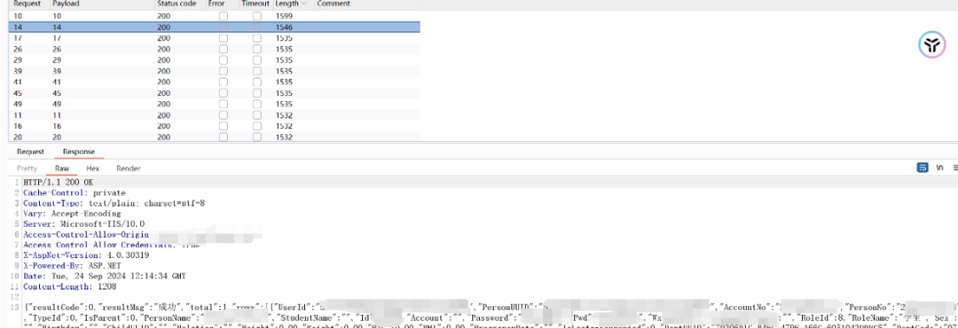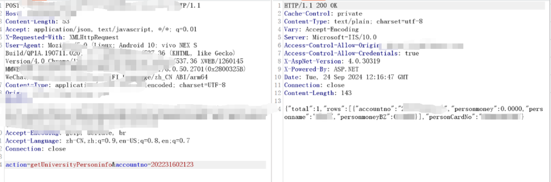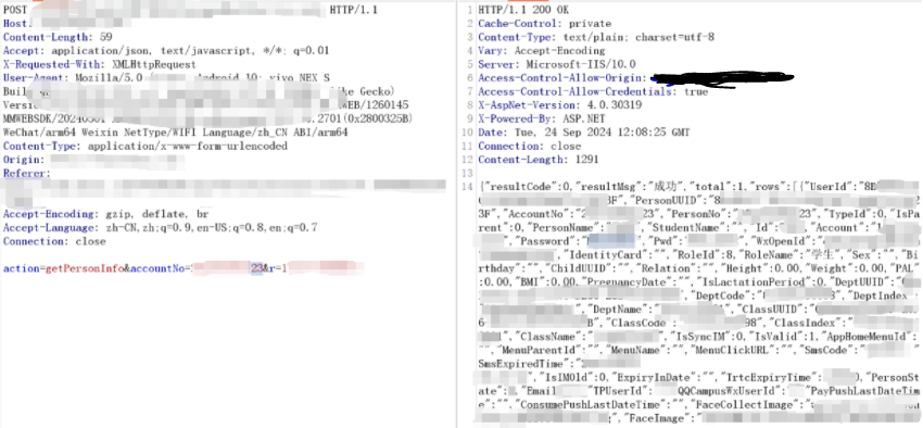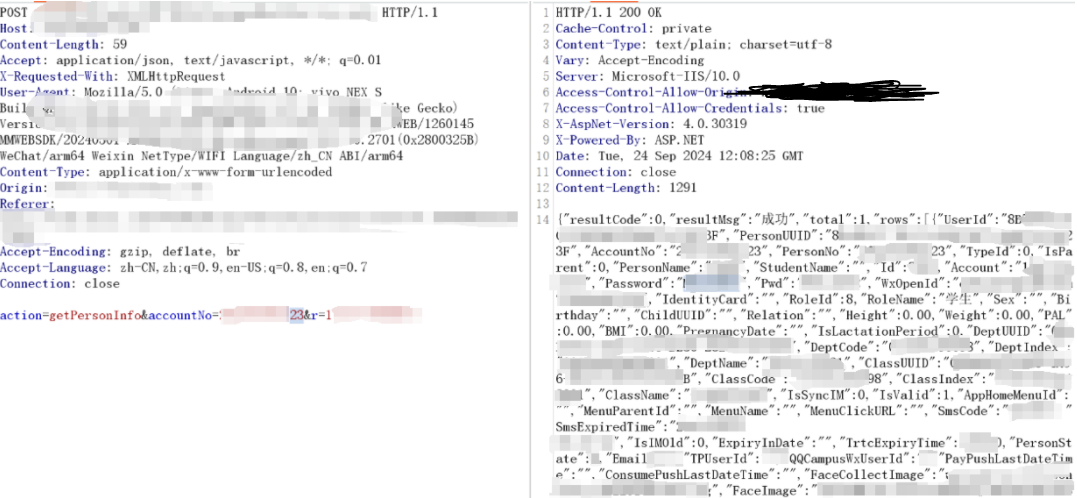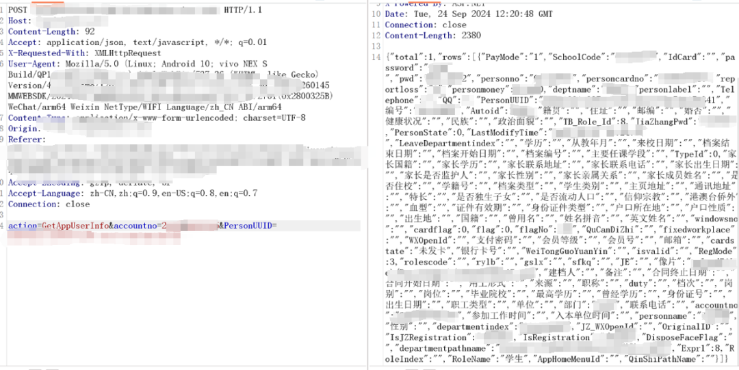 从下图数据包中可以看到通过getPersonInfo功能点的accountNo参数可以获取学生的敏感数据包括代表个人身份的PersonUUID和UserId和手机号,WxopenId和账号密码等敏感信息