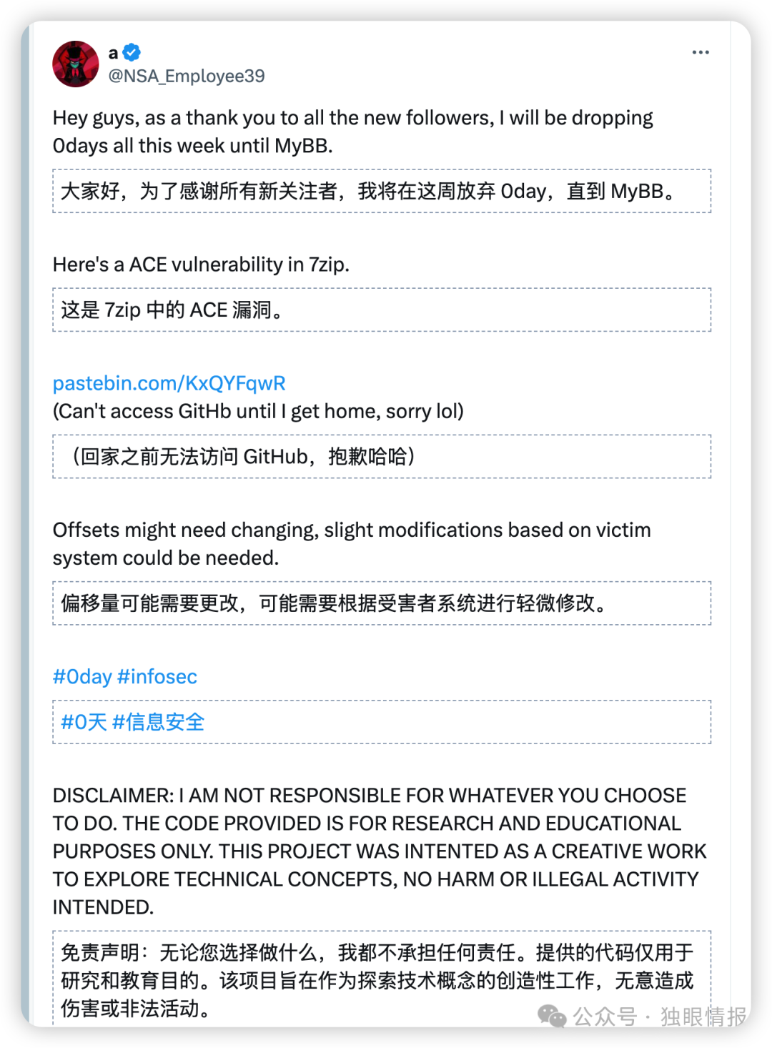 X 用户宣布它将“在本周内发布 0day 漏洞”,首先是开源软件 7-Zip 中的任意代码执行漏洞。