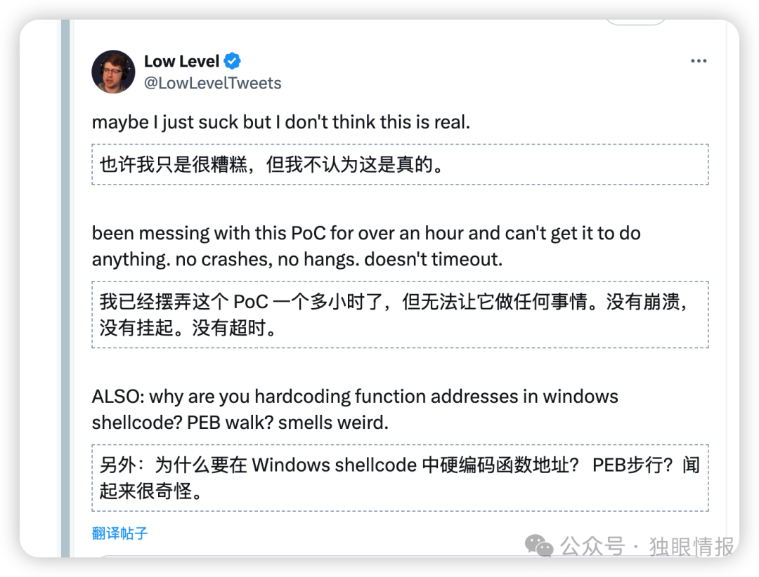 “普遍的结论是,来自 Twitter 的这个虚假漏洞代码是由 LLM(AI)生成的。 ” Pavlov写道。