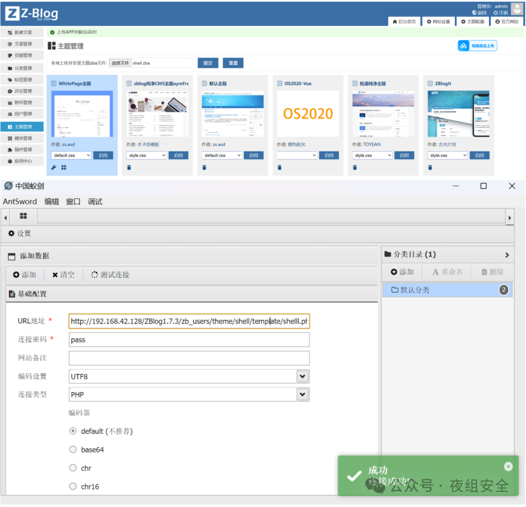 登陆管理后台后,通过上传精心构造的zba主题文件,成功将木马存放至\zb_users\theme\shell\template\目录下,使用中国蚁剑连接成功