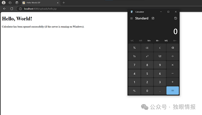 • 恶意 JSP 文件被执行,服务器上的计算器应用程序被打开(如果运行在 Windows 上)。