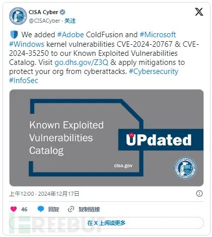 另外一个漏洞编号是CVE-2024-20767:此漏洞影响 Adobe ColdFusion,涉及不当的访问控制。攻击者可以利用此类漏洞来获取敏感信息或系统的未经授权访问,对网络安全构成重大威胁。对此,CISA 的操作指令(BOD)22-01,题为“减少已知被利用漏洞的重大风险”,要求联邦政府行政部门(FCEB)机构在指定的截止日期前修补这些漏洞,并表示“此类漏洞是一种常见的攻击途径,对联邦企业构成重大风险。”