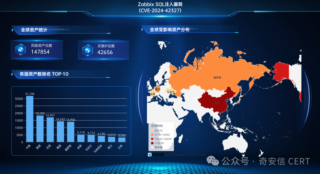 **Zabbix SQL注入漏洞(CVE-2024-42327)关联的全球风险资产总数为147854个,关联IP总数为42656个。全球风险资产分布情况如下: