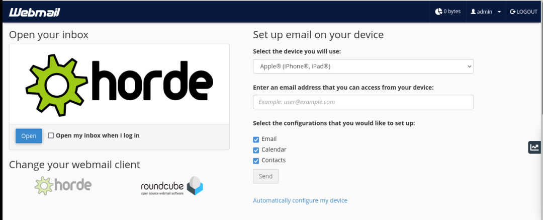 默认horde webmail没有配置邮箱用户,可以使用Ubuntu系统的用户进行登录,成功,如下图