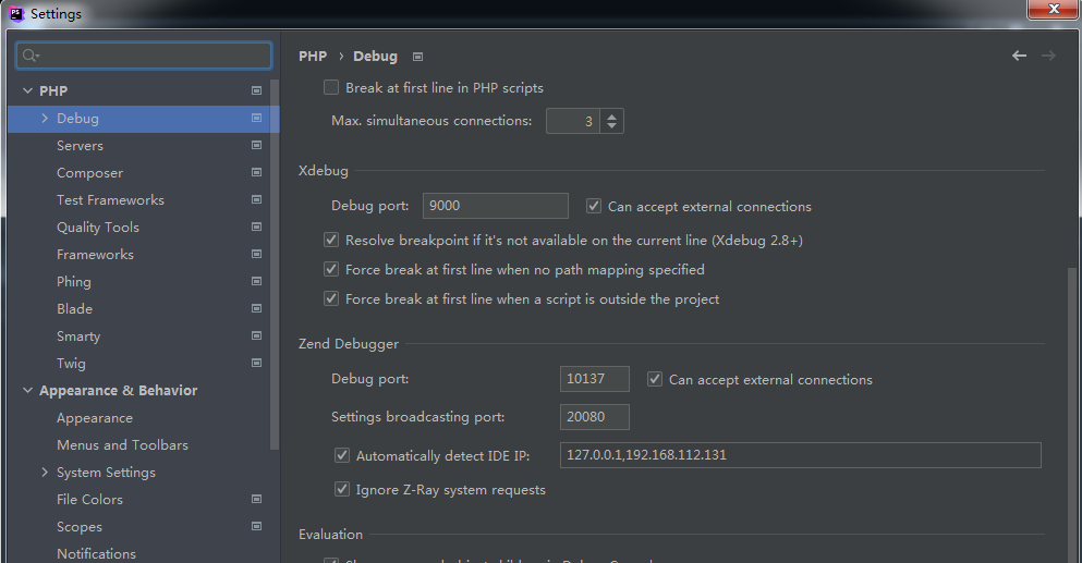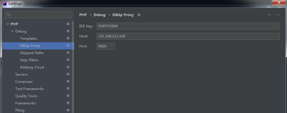 依次打开File -> Settings -> PHP -> Debug -> DBGp Proxy,填入以下信息: