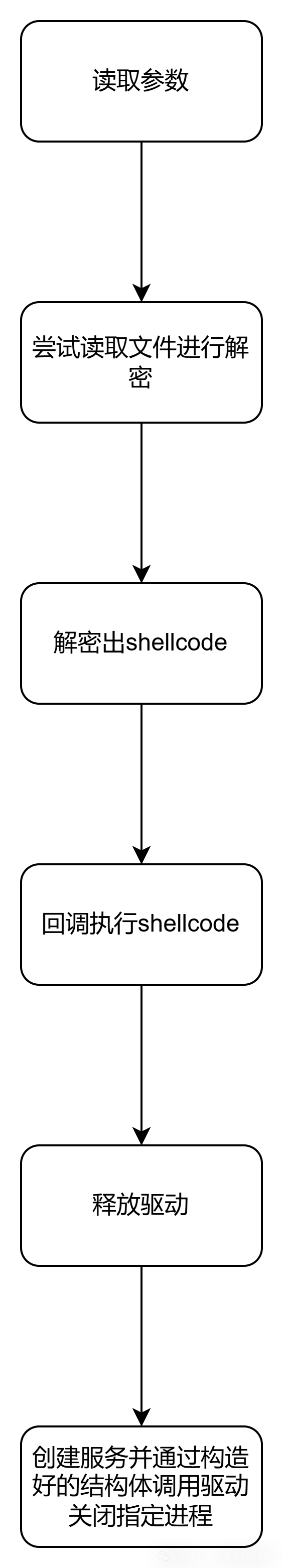 该程序执行流程如下,通过BYOVD利用漏洞驱动对杀软进行强关