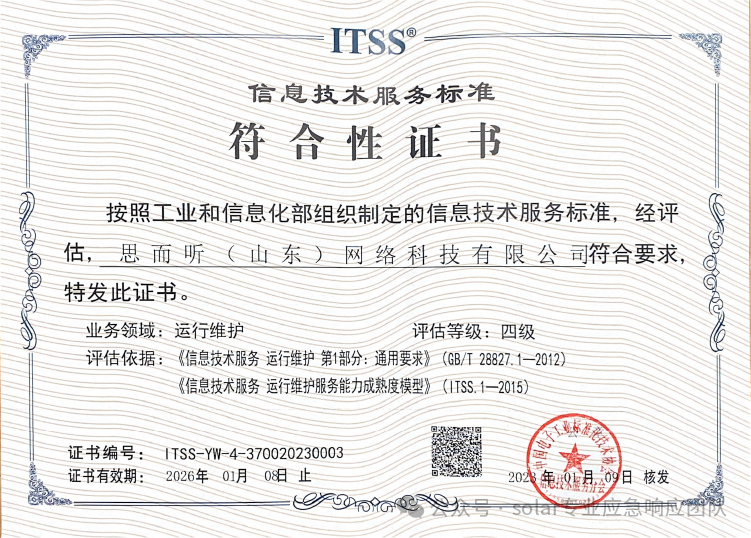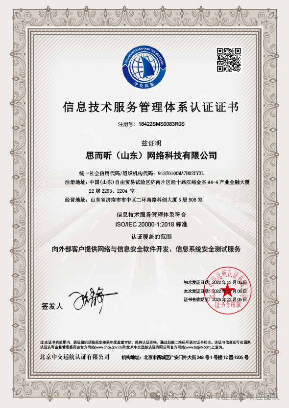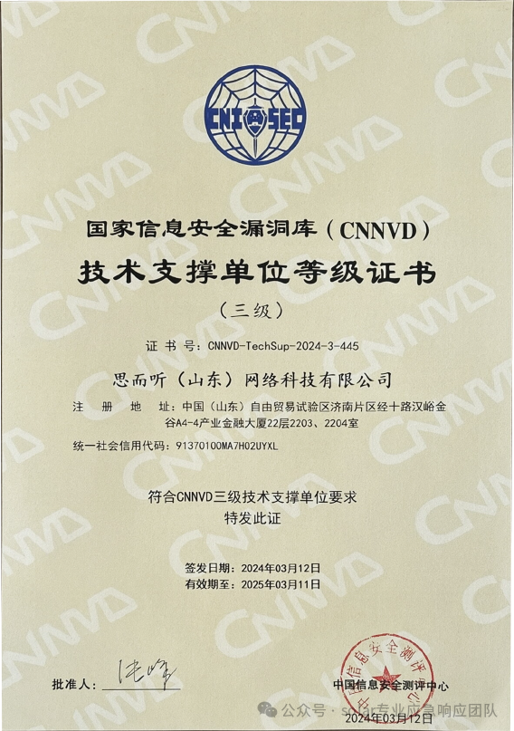 团队也先后通过了科技型中小企业、创新型中小企业认证、ISO9001质量管理体系、ISO14000环境管理体系、ISO45001职业安全健康管理体系 、ITSS(信息技术服务运行维护标准四级)以及国家信息安全漏洞库(CNNVD)技术支撑单位等认证,已构建了网络安全行业合格的资质体系。