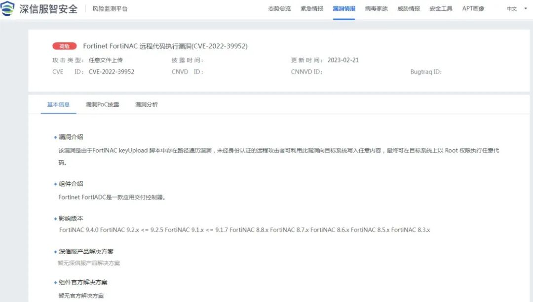 2023 年 2 月 22 日,深信服安全团队监测到一则 Fortinet FortiNAC 存在远程代码执行漏洞的信息,漏洞编号:CVE-2022-39952,漏洞威胁等级:高危。