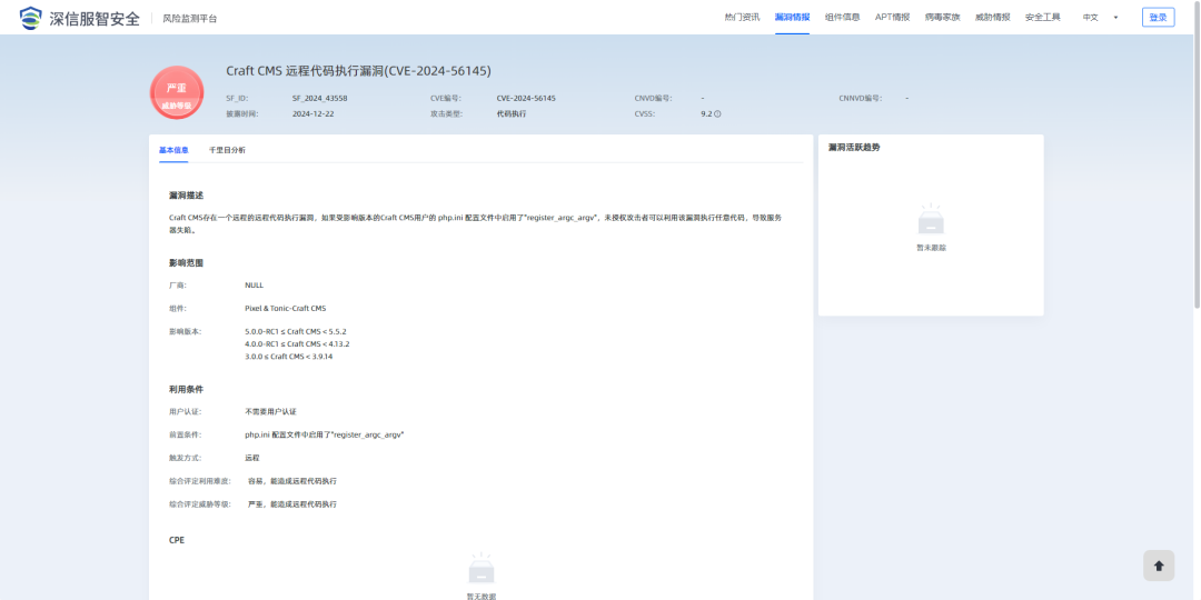 2024年12月23日,深瞳漏洞实验室监测到一则Craft CMS组件存在代码执行漏洞的信息,漏洞编号:CVE-2024-56145,漏洞威胁等级:严重。