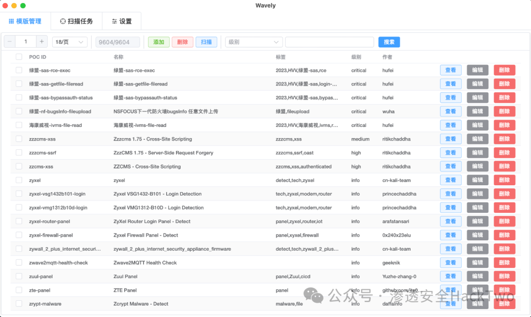 Wavely是一个nuclei POC管理工具,支持模板的增删查改、请求响应包查看、并行扫描等功能,兼容MacOS、Windows和Linux系统。它采用全新的nuclei v3检测引擎,支持自定义DNSLOG服务器和多种模板导入方式,并提供主题切换、HTTP代理设置等功能。