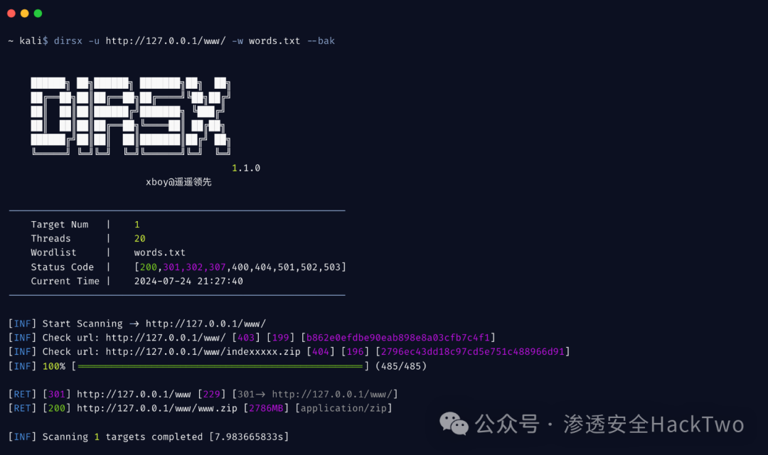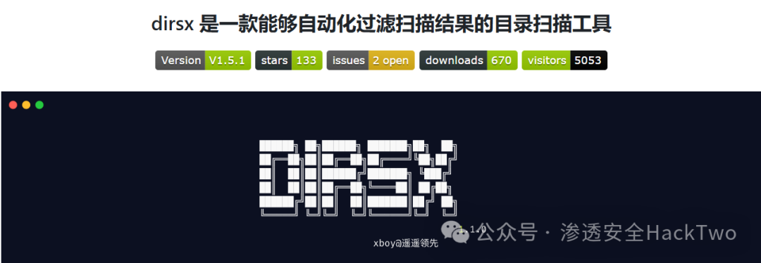 指定添加后缀进行扫描dirsx -u https://www.baidu.com -w words.txt –suffix h5# https://www.baidu.com/admin# -> https://www.baidu.com/adminh5指定添加 cookie | headers# –cookiedirsx -u https://www.baidu.com -w words.txt –cookie “session=admin”# –headersdirsx -u https://www.baidu.com -w words.txt –headers “Authorization: bearer eyJ0eX…” –headers “X-Forwarded-For: 127.0.0.1″# –headers-filedirsx -u https://www.baidu.com -w words.txt –headers-file headers.txt内置一些常用字典选择, 在没有指定字典时显示该列表常见目录字典dirsearch 的自带字典长度为 1-5 的字母组合… …~ kali$ dirsx -u http://127.0.0.1/ ██████╗ ██╗██████╗ ███████╗██╗ ██╗ ██╔══██╗██║██╔══██╗██╔════╝╚██╗██╔╝ ██║ ██║██║██████╔╝███████╗ ╚███╔╝ ██║ ██║██║██╔══██╗╚════██║ ██╔██╗ ██████╔╝██║██║ ██║███████║██╔╝ ██╗ ╚═════╝ ╚═╝╚═╝ ╚═╝╚══════╝╚═╝ ╚═╝1.1.0 xboy@遥遥领先[+] You have not appoint payloads, so you can select from the list: [0] fuzzing-dirs-common.txt[1] fuzzing-dirs-dirsearch.txt[2] fuzzing-files-php.txt[3] fuzzing-letter-len1.txt[4] fuzzing-letter-len2.txt[5] fuzzing-letter-len3.txt[6] fuzzing-letter-len4.txt… …[+] Select payloads with number: 1–httpx 模式增加 httpx 模式, 可以在没有 httpx 工具的情况下用来探测 WEB 服务dirsx -u https://www.baidu.com –httpx–ffuf 模式增加 ffuf 模式, 用法与 ffuf 工具一样, 使用 FUZZ 指定 Fuzzing 位置# Fuzzing dirsdirsx –ffuf -u http://127.0.0.1/FUZZ -w words.txtdirsx –ffuf -u http://127.0.0.1/FUZZ.php -w words.txtdirsx –ffuf -u http://127.0.0.1/FUZZ/index.php -w words.txt# Fuzzing headersdirsx –ffuf -u http://127.0.0.1/ -H “x-forwarded-for: FUZZ”dirsx -h~ kali$ dirsx -h ██████╗ ██╗██████╗ ███████╗██╗ ██╗ ██╔══██╗██║██╔══██╗██╔════╝╚██╗██╔╝ ██║ ██║██║██████╔╝███████╗ ╚███╔╝ ██║ ██║██║██╔══██╗╚════██║ ██╔██╗ ██████╔╝██║██║ ██║███████║██╔╝ ██╗ ╚═════╝ ╚═╝╚═╝ ╚═╝╚══════╝╚═╝ ╚═╝ 1.1.0 xboy@遥遥领先Usage: dirsx [OPTIONS]Application Options: -u, –url= input url of target -l, –list= input file containing list of target -w, –wordlist= appoint wordlist for scanning directory–title-len= set title display length (default: 30) -t, –threads= number of threads to use (default: 20)–timeout= timeout in seconds (default: 5) -o, –output= file to write output results–prefix= add prefix of payloads–suffix= add suffix of payloads -e, –extension= add extension eg: -e php,html–remove-ext= remove extension eg: –remove-ext php | admin.php -> admin–upper-title capitalize the first letter eg: admin -> Admin–upper-all capitalize the all letter eg: admin -> ADMIN–bak enable scanning backup file (default:false)–split enable spliting the url path, eg: /a/b -> /a/, /a/b (default: false) -X= method of http requests (default: GET) -x, –excode= specify the status codes that be filtered eg: 400,404 (default: 400,404,406,416,501,502,503)–cookie= set request cookies, eg: –cookie “session=admin” -H, –headers= set request headers, string[] eg: -H “Token: admin=true” -H “Cookie: login=true”–headers-file= set request headers file, eg: –headers-file headers.txt–proxy= set request proxy, eg: –proxy http://127.0.0.1:8080–no-smart disable smart mode (automated filtering)Help Options: -h, –help Show this help message字典添加可在 dicts 目录下根据个人需求更新常用字典dirsx $ tree.├── dicts│ ├── fuzzing-dirs-common.txt│ ├── fuzzing-dirs-dirsearch.txt│ ├── fuzzing-files-php.txt│ ├── fuzzing-letter-len1.txt│ ├── fuzzing-letter-len2.txt│ ├── fuzzing-letter-len3.txt│ ├── fuzzing-letter-len4.txt│ ├── fuzzing-months-1-12.txt│ ├── fuzzing-numbers-0-9.txt│ ├── fuzzing-payloads-aspx.txt│ ├── fuzzing-payloads-bakfile.txt│ ├── fuzzing-payloads-common.txt│ ├── fuzzing-payloads-java.txt│ ├── fuzzing-payloads-null.txt│ ├── fuzzing-payloads-php.txt│ ├── fuzzing-routers-common.txt│ ├── fuzzing-words-len1-5.txt│ └── fuzzing-years-1990-2024.txt├── dirs