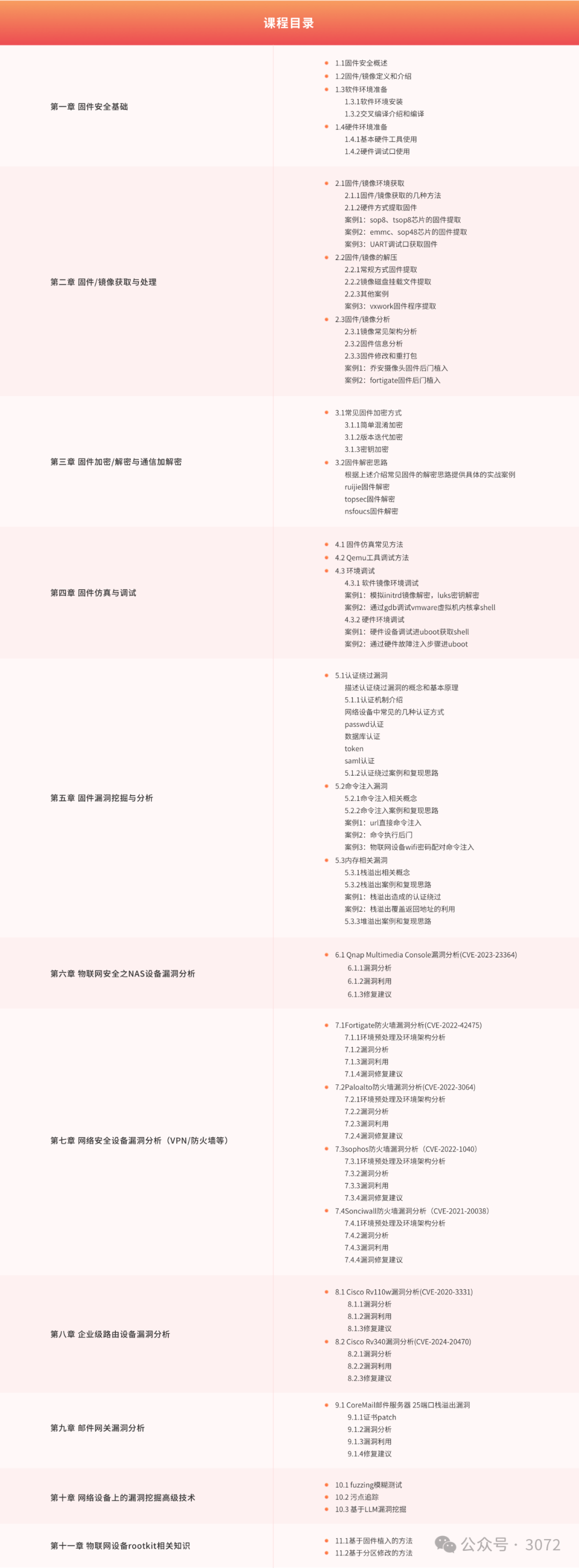 1. 完整的知识体系:从固件安全基础、设备通信原理、调试技术,到漏洞挖掘方法论,层层递进,构建完整的技术知识体系。