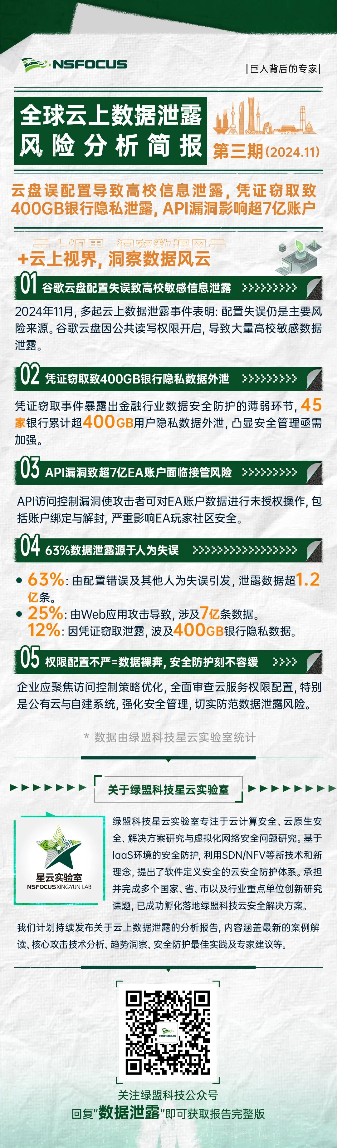 全球云上数据泄露风险分析简报 (第三期):云盘误配置与API漏洞致高校信息泄露,影响7亿账户 发布于2024年12月9日2025年7月19日 作者:cve-20 全球云上数据泄露风险分析简报 (第三期):云盘误配置与API漏洞致高校信息泄露,影响7亿账户 原创 创新研究院 绿盟科技研究通讯 2024-12-09 04:00