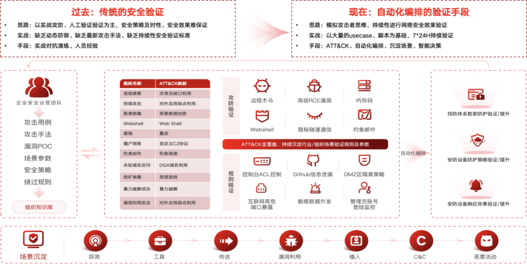 红队提升:站在攻击者角度,模拟真实的APT攻击手段,细粒度地评估客户安全防御体系能力。在整体建设中,可分为自动化攻击模拟、智能决策调整、社会工程学攻击、大数据攻击分析四步。