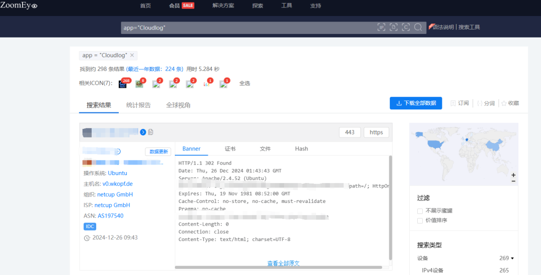 根据ZoomEye网络空间搜索引擎关键字 app=”Cloudlog” 对潜在可能目标进行搜索,共得到298条IP历史记录。主要分布在德国、美国等国家。(ZoomEye搜索链接: