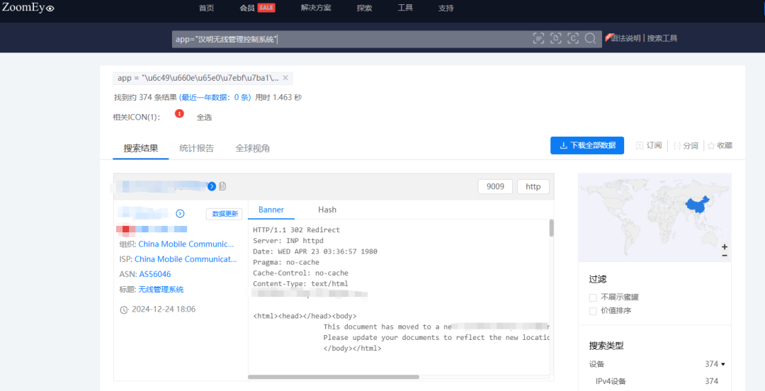 根据ZoomEye网络空间搜索引擎关键字 app=”汉明无线管理控制系统” 对潜在可能目标进行搜索,共得到374条IP历史记录。主要分布在中国广东、湖南等地。(ZoomEye搜索链接: