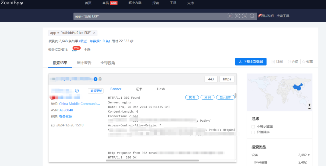 根据ZoomEye网络空间搜索引擎关键字 app=”蓝凌 EKP” 对潜在可能目标进行搜索,共得到2648条IP历史记录。主要分布在中国、美国等国家。(ZoomEye搜索链接: