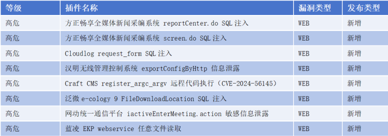 本周累计更新漏洞插件69个,其中重点插件8个