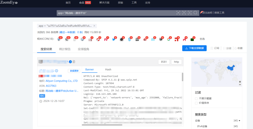 根据ZoomEye网络空间搜索引擎关键字 app=”网动统一通信平台” 对潜在可能目标进行搜索,共得到366条IP历史记录。主要分布在中国、美国等国家。