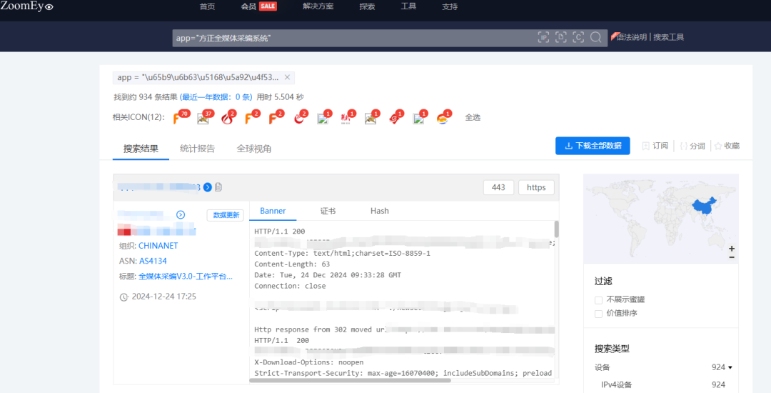 根据ZoomEye网络空间搜索引擎关键字 app=”方正全媒体采编系统” 对潜在可能目标进行搜索,共得到934条IP历史记录。主要分布在中国、马来西亚。(ZoomEye搜索链接: