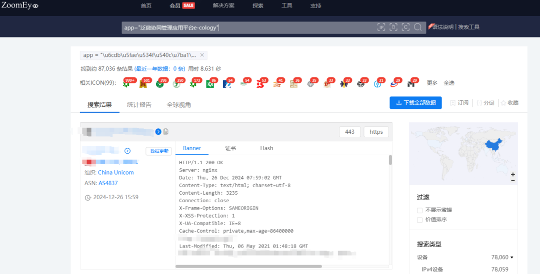 根据ZoomEye网络空间搜索引擎关键字 app=”泛微协同管理应用平台e-cology” 对潜在可能目标进行搜索,共得到87036条IP历史记录。主要分布在中国、美国等国家。