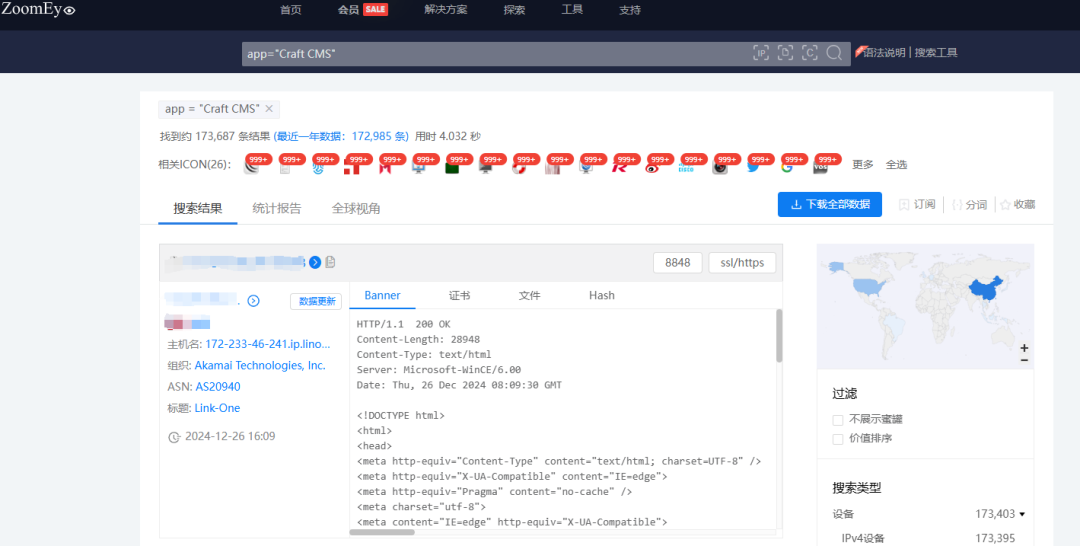 根据ZoomEye网络空间搜索引擎关键字 app=”Craft CMS” 对潜在可能目标进行搜索,共得到173687条IP历史记录。主要分布在中国、美国等国家。(ZoomEye搜索链接: