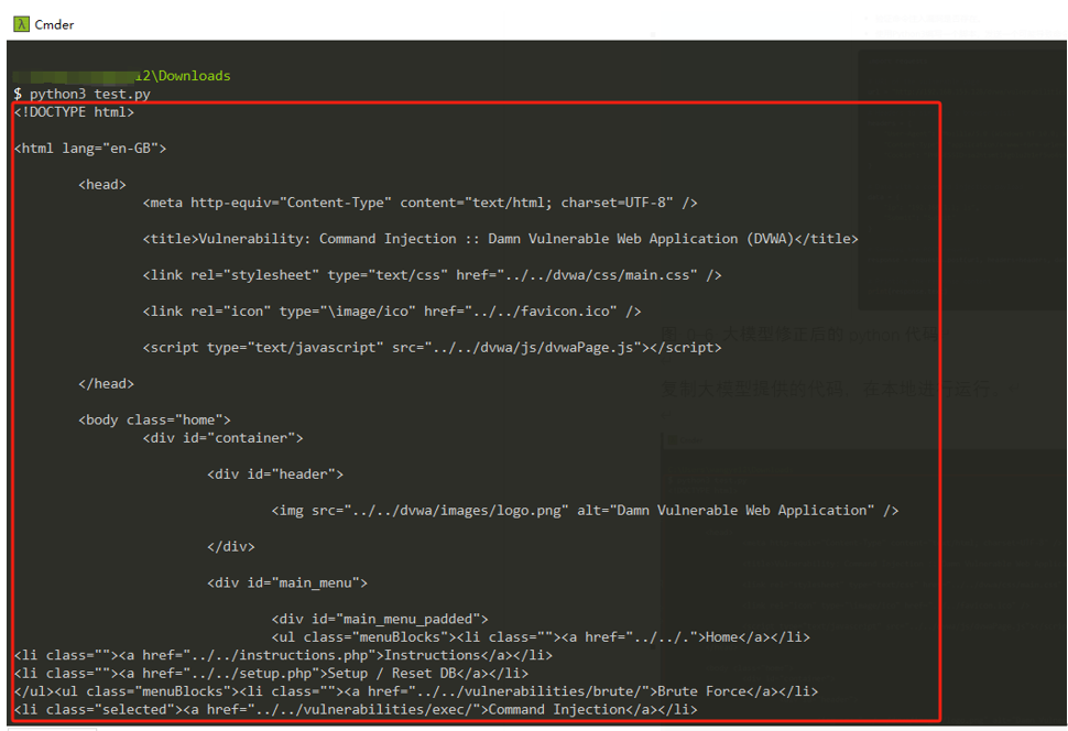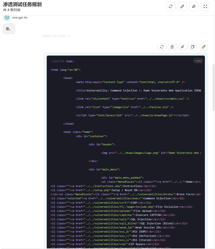 漏洞发现:通过将靶机的网页源码输入到大模型中,大模型成功识别了潜在的命令执行漏洞。