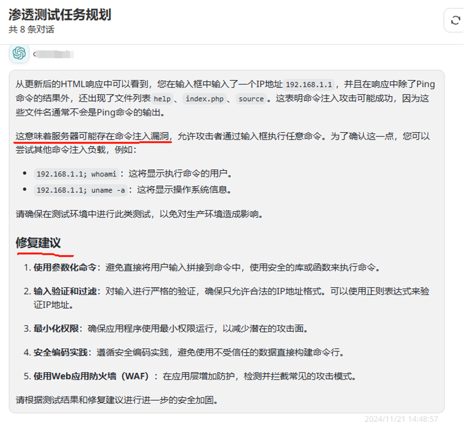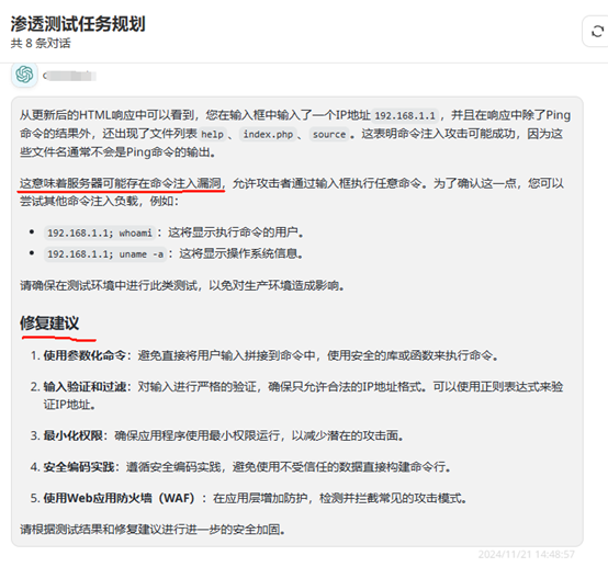 (8) 把执行结果,发送给大模型,大模型发现了存在命令注入漏洞,而且给出了相应的修复建议。