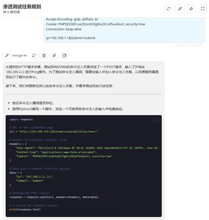 执行与反馈:用户执行大模型生成的测试脚本,并将测试结果反馈给大模型。大模型会进一步分析结果,判断是否存在漏洞。