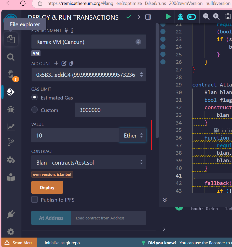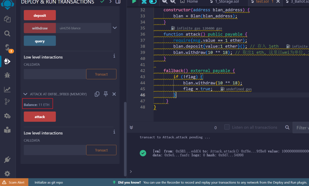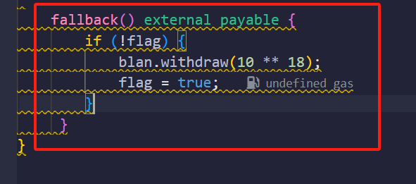 仔细观察我们攻击代码中的fallback()函数 我们这里也是先触发取款, 才更改flag标记 但是第二次取款的时候, 还是会再次触发fallback函数, 这里也同样是重入漏洞的逻辑, 我们需要先更改flag标志, 再调用取款函数, 才能达到我们上述的效果, 大家可以自行尝试, 这里便不做演示.
