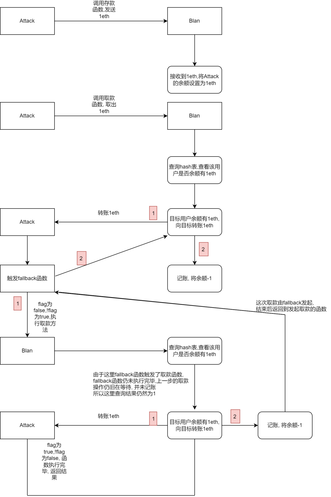 流程图中很明显的告诉我们 漏洞触发的原因是, 当转账给一个智能合约时 会等待该合约的 fallback() 函数执行完成后 才算这行代码执行完毕, 才会接着继续下一行代码 其中利用的像是一种递归的思想