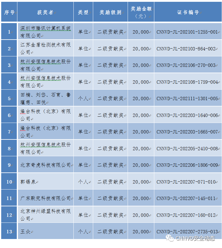 2022年度CNNVD漏洞奖励评选结果公告