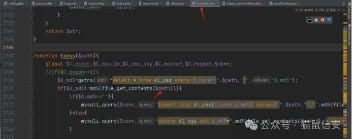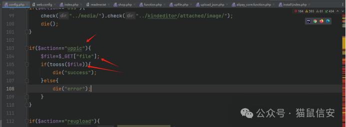 当action等于uppic时,使用get的方式传参,并把file的值传到file变量,此后再进入if(tooss($file))进行判断