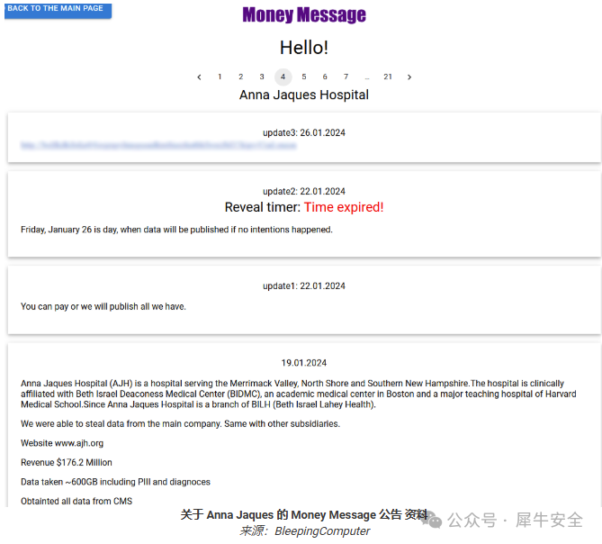 随后,Money Message 页面的更新显示,医院管理人员并未与威胁行为者交涉,最终于 1 月 26 日公布了所有数据。