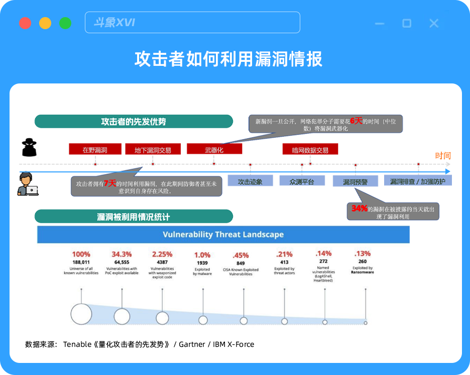 如果让攻击者在漏洞爆发后的时间线中取得先发优势,将给安全团队带来巨大防守压力。研究显示高达34%的漏洞,在漏洞被披露的当天就出现了漏洞利用活动。攻击者如拥有较长的“漏洞利用时间窗口”,防御者将难以防范。