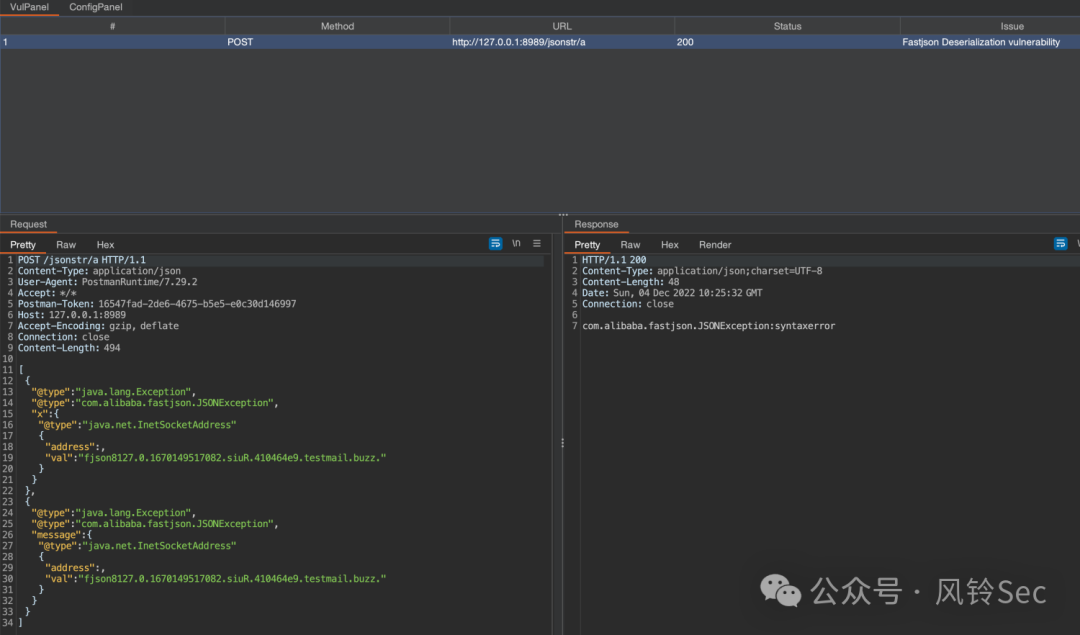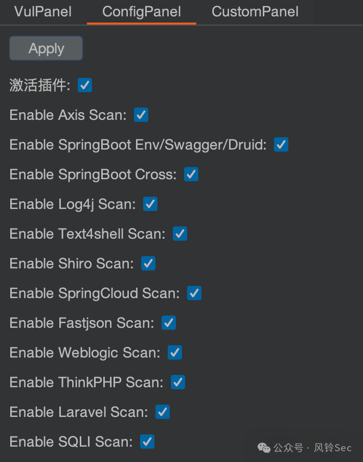 :包括了对 Nacos 漏洞(CVE-2021-29441、QVD-2023-6271)的被动扫描,Fastjson 参数扫描,Spring Boot、Druid、Swagger 等相关漏洞的主动扫描,ThinkPHP 多语言 RCE 漏洞扫描,Ueditor 文件上传漏洞扫描等。